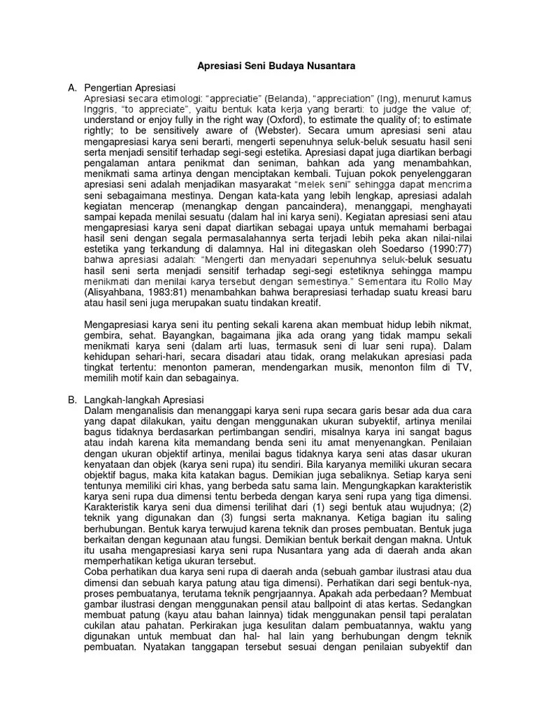 Apa Yang Dimaksud Apresiasi Karya Seni Rupa : Top Pdf Apresiasi Karya Seni Rupa 123dok Com / Analisis simbol akan memudahkan kita untuk mengetahui maksud atau arti dari lukisan yang kita amati.. Pengertian dan fungsi apresiasi karya seni yang akan dijelaskan yakni definisi apresiasi, makna apresiasi dalam arti luas, #3 tingkatan apresiasi dan . Sebetulnya, masih banyak pisau analisis . Apresiasi adalah suatu proses melihat, mendengar, menghayati, menilai,. Apresiasi seni juga dapat diartikan sebagai kesadaran dalam menilai suatu karya seni dengan cara menghayatinya. Kegiatan apresiasi karya seni juga bisa terbentuk dari dua kemungkinan yaitu efektif dan juga kreatif.